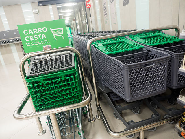 Uno de los elementos que más llama la atención al cliente cuando entra en la nueva tienda de Mercadona es que los típicos cestos para pequeñas compras han desaparecido. Ahora en las tiendas eficientes de Mercadona se ofrecen carros para compras grandes y carros con ruedas para compras pequeñas, (llamados carro-cestas) ambos más ergonómicos que los anteriores y hechos totalmente de plástico para que pesen lo menos posible.