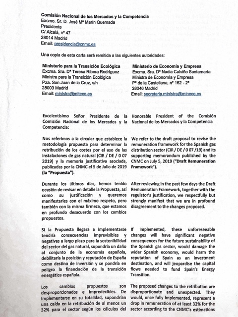 “Somos inversores internacionales de largo plazo, que representamos a fondos de pensiones, aseguradoras y firmas de inversión privada que han invertido miles de millones de euros en el sistema de distribución de gas español desde 2015 (…) y en su nombre nuestra inversión se basó en la existencia de una regulación estable y madura”.