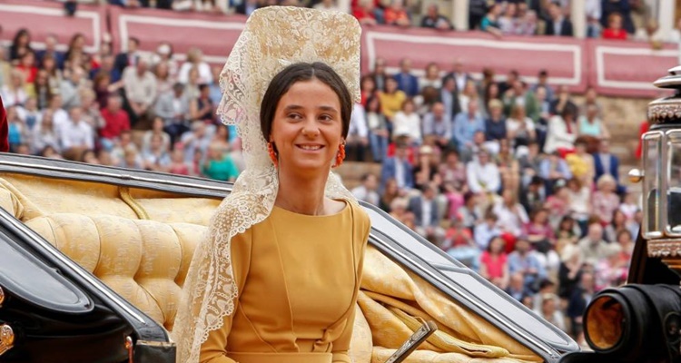 Lució un look tradicional, adecuado para estos actos: vestido en color mostaza de Enrique Rodríguez Hidalgo, mantilla, abanico, pendientes naranjas y un impresionante mantón de Manila en color berenjena. Los zapatos que escogió también fueron impresionantes: unos Manolo Blahnik rojos con pompones.