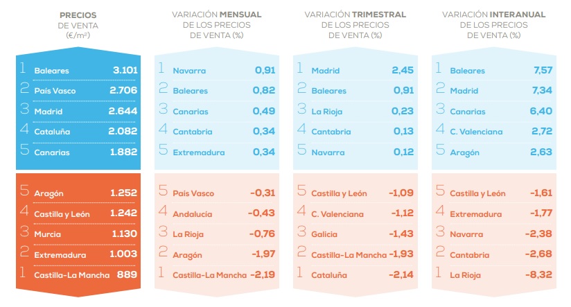 En cuanto a los municipios, por encima de los 5.000 euros por metro cuadrado solo estuvieron Sant Josep de Sa Talaia, Ibiza, Santa Eulalia del Río y Sant Antoni de Portmany, todos en Baleares. Por debajo de los 600 euros se hallaron Caudete (Albacete), Yecla (Murcia) y Calasparra (Murcia).