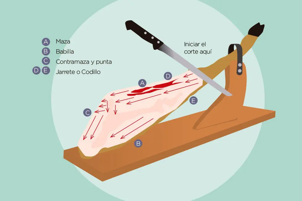 Cuando no se posee tiempo o cortar jamón ibérico se te da mal, no hay de qué preocuparse. Todo es ponerse y todo rodará. Para comenzar, debes de poner el jamón en el jamonero con la pezuña mirando hacia arriba. Se comenzará a cortar por la zona de la maza.