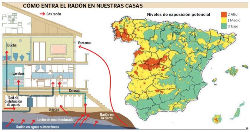 El gas radón es ni más ni menos que la mayor fuente de radiación natural en el mundo. En España, la parte de mayor riesgo de sufrir problemas con radón es Galicia, más concretamente Pontevedra y Ourense. Le sigue Castilla y León, Extremadura, Madrid y algunas partes de Castilla-La Mancha.