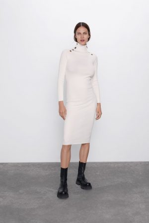 Comenzamos este recopilatorio de los vestidos de otoño más bonitos para lucir un look de escándalo, con este modelito de Zara. Hablamos de un vestido entallado de punto, con cuello subido y manga larga, por lo que el frío no va a ser un problema mientras lo usas.