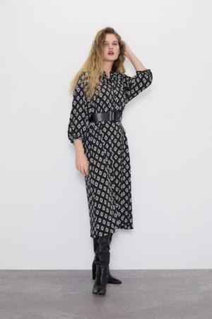 Otro vestido de otoño capaz de rivalizar con los de Zara, es este modelo estampado en tejido de viscosa. Hablamos de un vestido con escote barco, cremallera oculta en la espalda, mangas globo largas y puños anchos con botón revestido. Además, la cintura en forma de V con falda acampanada le da un toque muy diferente.