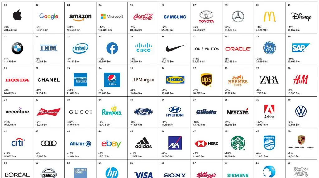 La suma total del valor de las 100 marcas del informe alcanza los 2,1 billones de dólares (1,89 billones de euros), lo que supone un aumento del 5,7% respecto al valor registrado el año pasado.