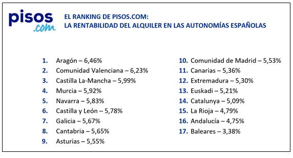 El ranking de pisos.com sobre la rentabilidad bruta del alquiler de viviendas en España muestra un canal que va desde el 6,46% registrado en Aragón al 3,38% en Baleares. En el análisis por comunidades autónomas, los precios competitivos para la compra de residencias en autonomías como Aragón, Castilla La-Mancha, Murcia y Navarra las colocan junto a la Comunidad Valenciana en lo alto de una lista que cierran La Rioja, Andalucía y Baleares, esta última por el elevado precio de compra de las propiedades y su elevada superficie.