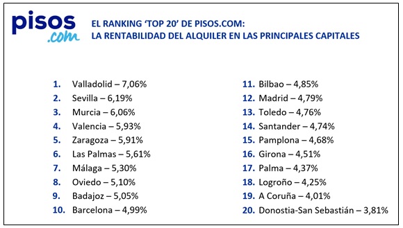 Si se amplía el análisis a la rentabilidad media del alquiler registrada en las 20 principales capitales españolas durante el tercer trimestre, Valladolid fue la más rentable con un porcentaje del 7,06%. Tras la ciudad castellana se situaron Sevilla (6,19%), Murcia (6,06%), Valencia (5,93%) y Zaragoza (5,91%). El ranking lo cierran las ciudades de Logroño (4,25%), A Coruña (4,01%) y Donostia-San Sebastián (3,81%), esta última por tratarse de la localidad más cara de España para la compra de una vivienda.