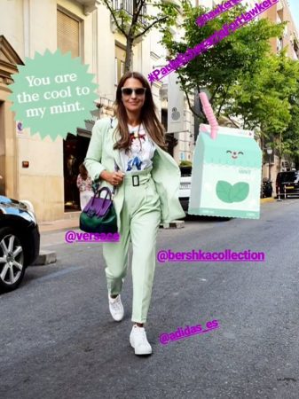 Y claro, siguiendo la moda de las dos piezas, se ha comprado un traje color menta que le da un toque realmente increíble. La combinación escogida para lucir como una diva es: un dos piezas versión traje de Bershka, zapatillas Adidas y bolso de Versace.