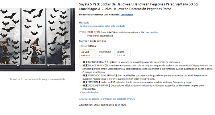 Ya hemos hablado de las pegatinas de la ventana, pero no de las pegatinas para la pared, pues en estas fiestas, también es muy común decorar la pared (aunque estas pegatinas también valen para la ventana). En este caso, la temática son los murciélagos, el cual, es un animal terrorífico por excelencia.