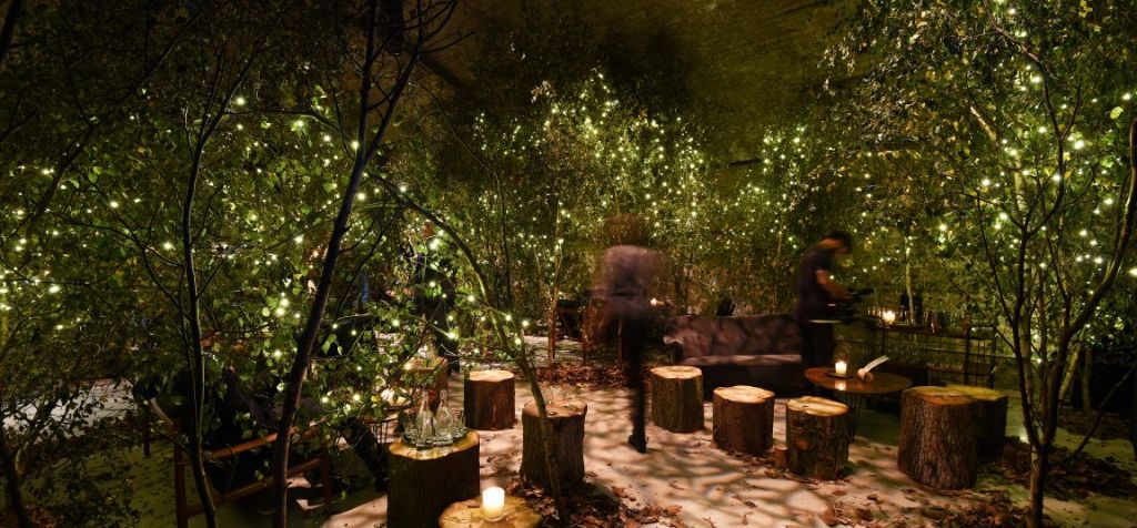 La iluminación se funde con todos los detalles vegetales por todos sus rincones, su techo abovedado y el uso de materiales naturales como elementos útiles, como troncos, etc.
