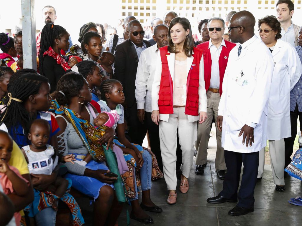 Letizia ha acudido a la clínica ataviada con un chaleco rojo como el que usan los cooperantes españoles en el país. Lo ha complementado con un traje de chaqueta en dos piezas en color beige, una blusa lencera en color rosa pálido, y unos mocasines de piel.