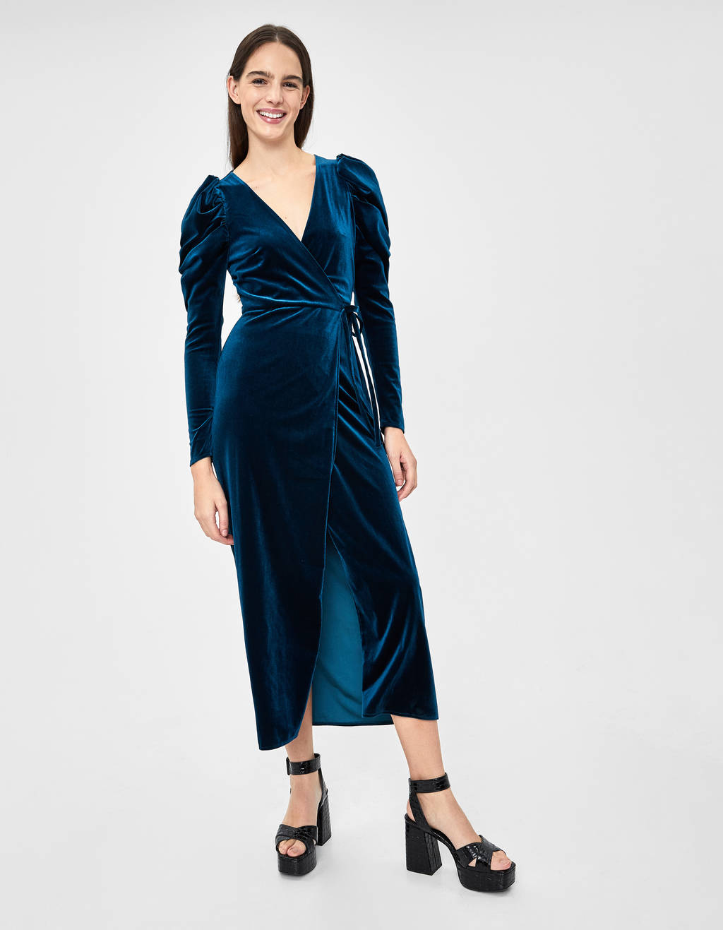 En este caso tenemos un vestido largo de terciopelo con escote en pico cruzado y manga larga con volumen en hombros, cintura ajustada y abertura frontal. El precio es bastante económico ya que solo cuesta 29,99 euros. Así que es una buena opción y un básico en el armario ya que cada otoño el terciopelo vuelve a salir y a ser uno de lo tejidos protagonistas.