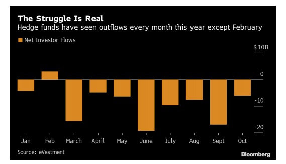 El caso de Moore Capital Management no es un caso aislado en la industria financiera. Los inversores siguen castigando a los fondos de cobertura. Los gestores sufrieron el octavo mes consecutivo de retiros de clientes en octubre, el período más largo de retiros desde la crisis financiera de 2008, según un informe de eVestment de esta semana dado a conocer por Bloomberg.