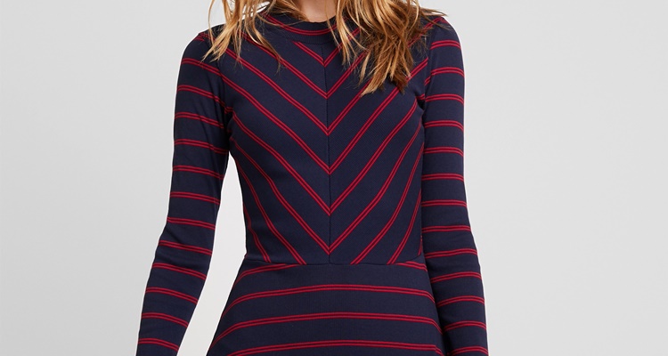 Si quieres estrenar una prenda con estilo, apuesta por este vestido de punto de rayas en colores azul marino y rojo.