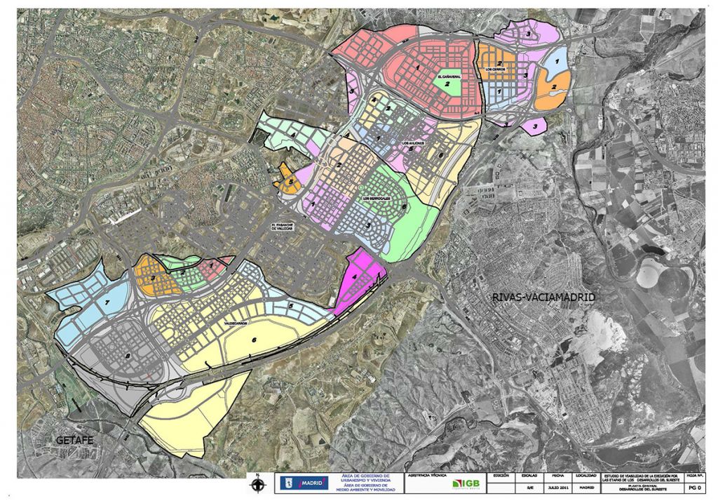 Para que se hagan una idea, estos terrenos forman un enorme rectángulo en el sur del término municipal de la capital. Sus extremos lo forman Getafe por el oeste, Coslada por el este, la M-45 por el norte y Rivas-Vaciamadrid por el sur. Con El Ensanche de Vallecas y El Cañaveral casi finalizados en su urbanización, los otros cuatro ámbitos aún por levantar se encuentran en un desarrollo diferente. Estos son Los Berrocales, Los Ahijones, Los Cerros y Valdecarros.