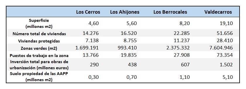 La inversión total para las obras de urbanización de estos cuatro ámbitos alcanzará 2.837 millones de euros. El montante una vez que, si todo sale bien tras quince años de obras y casi otros tantos de papeleos, estén levantadas las 104.737 viviendas habrá llegado a la cifra de 14.000 millones de euros.