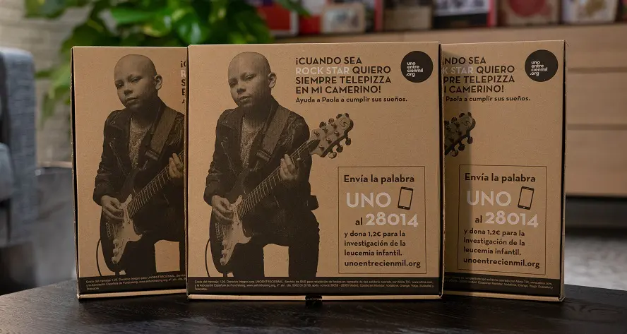 Durante este mes y hasta agotar existencias, la compañía anima a través de las cajas de sus telepizzas a que todos los hogares españoles ayuden a Paola a cumplir su sueño: ¡Cuando sea rockstar quiero siempre Telepizza en mi camerino! Todo el importe recaudado a través del envío de un SMS con la palabra UNO al 28014 irá destinado a financiar un proyecto de investigación sobre la leucemia infantil dirigido a la curación clínica de los menores.