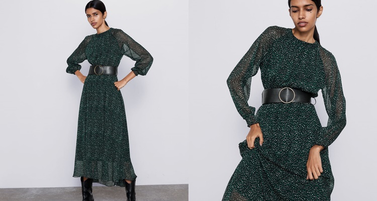 Mango también ha traído para esta temporada otoño invierno un vestido verde largo realmente bonito. Tiene un precio de 39,95 euros y demás incluye un cinturón ancho de cuero negro con gran hebilla para ceñir el vestido.