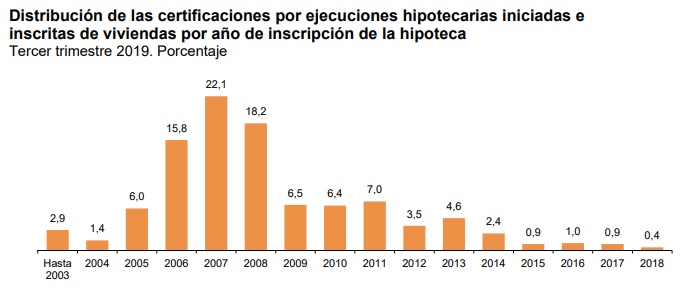España todavía arrastra las cadenas del boom inmobiliaro previo a la crisis. El periodo 2005-2008 concentra el 62,1% de las ejecuciones hipotecarias iniciadas este