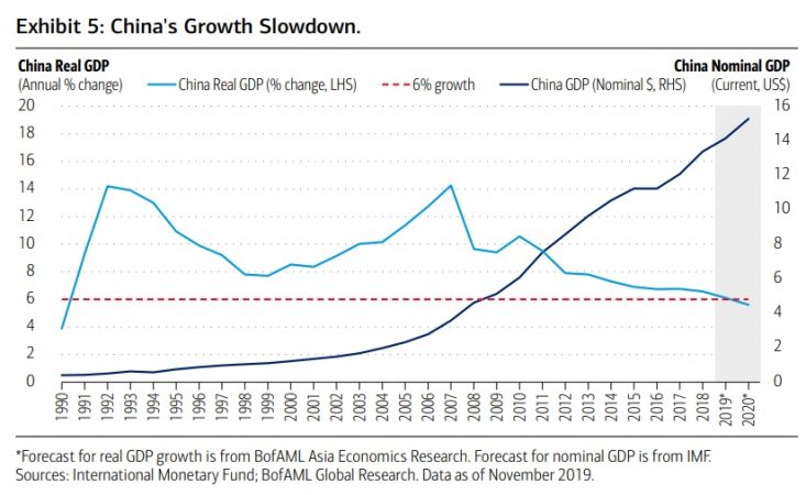 El año que viene será un año decisivo para China con un el crecimiento económico anual que estará por debajo del 6% por primera vez en tres décadas según las estimaciones de BofAML Global Investigación.La incertidumbre comercial entre Estados Unidos y China provocará en el país asiático una demanda interna más débil y tardía que reducirá el crecimiento al 5.6% en 2020, la lectura más suave desde el año 1990.