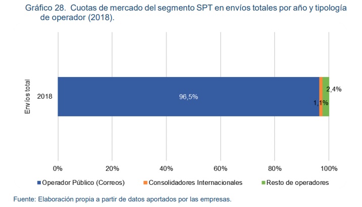 El número de operadores postales en España en 2018 alcanzó un total de 1.791. De estos, la empresa pública Correos es la que más peso tiene formando un monopolio en algunos servicios como los envíos postales electorales. La quiebra de rivales como Unipost le ha regalado mayor espacio en el segmento del Sistema Postal Tradicional (SPT); el mismo cuya pérdida de importancia es preocupante.