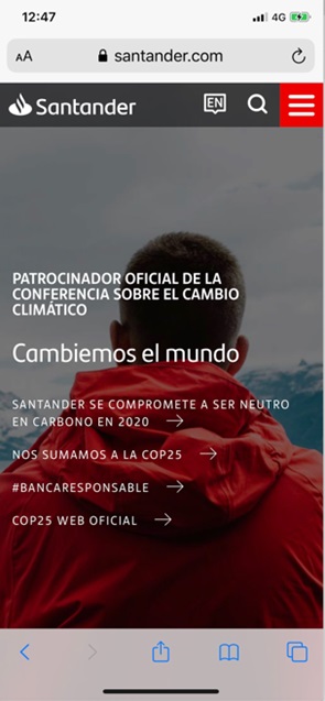 Santander.com también es “flat design” o de “diseño plano”, un concepto de elimina todo tipo de “decoraciones” en la interfaz web (texturas, degradados, biselados, sombreados…) para simplificar el mensaje y facilitar la funcionalidad y lectura. Además, el diseño es totalmente de filosofía “responsive”, lo cual significa que el web corporativo es de una usabilidad máxima en cualquier dispositivo, tanto móviles, tablets, portátiles u ordenadores fijos. El usuario consigue una experiencia “elástica” hecha a medida del dispositivo que use.