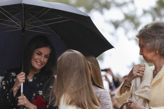 Al salir de la misa de Resurrección, comenzó a llover en Palma de Mallorca, algo de lo que parece que estaban avisados. En esos momentos, Letizia sacó su paraguas XXL para cubrirse de la lluvia. A ella y a sus hijas. Pero no a su suegra, Doña Sofía. Letizia pasó, literalmente, de ofrecerle resguardo a Sofía debajo del paraguas.