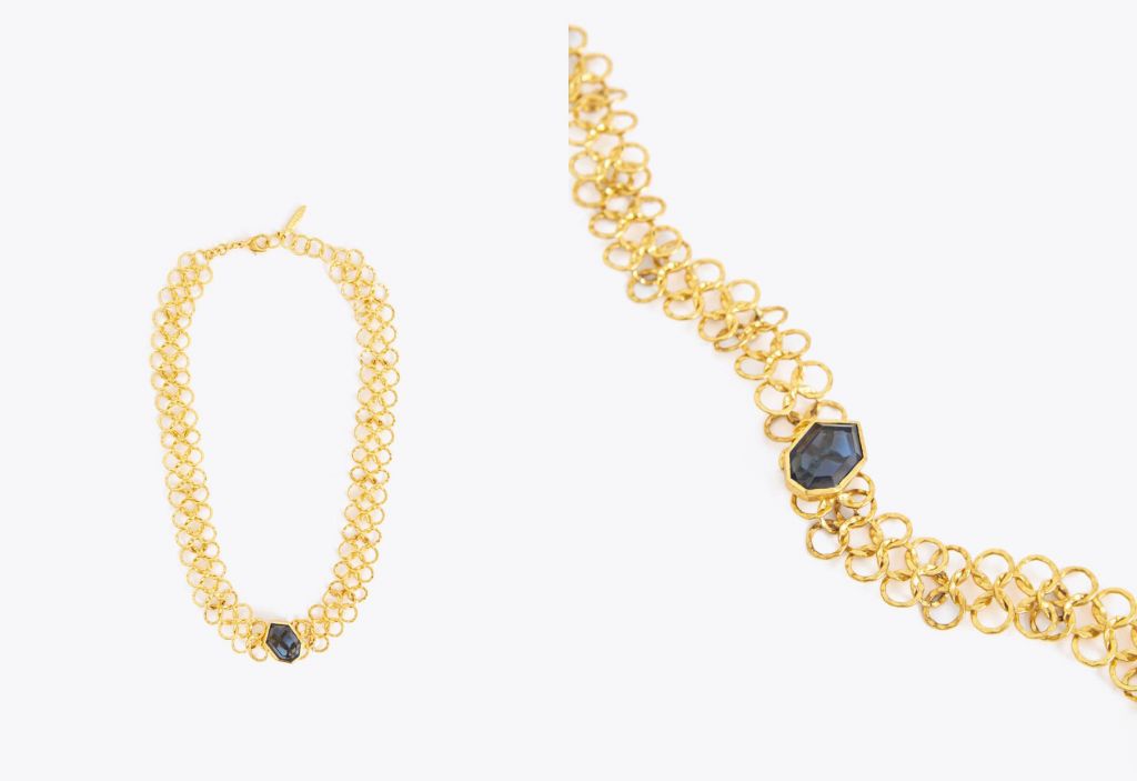 Esta pieza es la más cara de la colección limitada de joyas de Uterqüe. Se trata de un collar gargantilla con cadena metálica en forma circular que resalta una preciosa piedra azul.