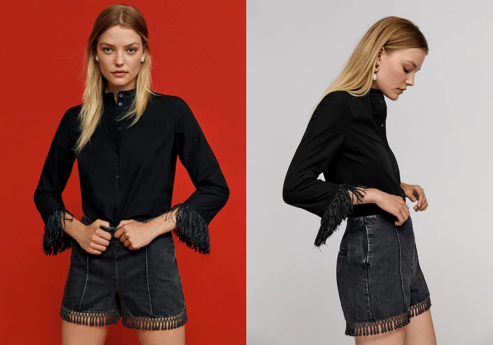 La blusa negra abotonada con adornos de flecos en los puños es algo que puedes combinar con casi todo. Con los jeans anteriores iría bastante bien. Sin embargo, la elección de Leandra Medine de usarla junto con los pantalones cortos de algodón queda algo extraña. Esta la encuentras al precio de 49,99 euros.
