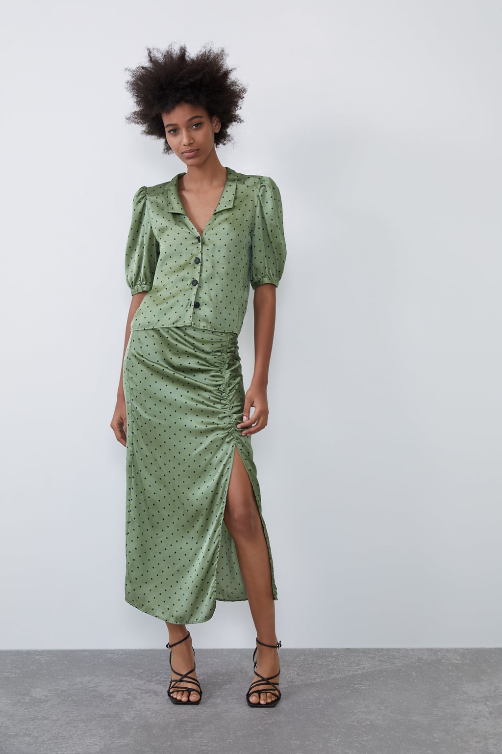Otro modelito de altura, y que es una de esas prendas de Zara que luciría Pilar Rubio sin problema alguno, es estafalda fluida de tiro alto con cremallera lateral. Como podrás comprobar, se puede combinar con la blusa con mangas abullonadas, pero su estilo retro no es del estilo de Pedroche o Pilar.