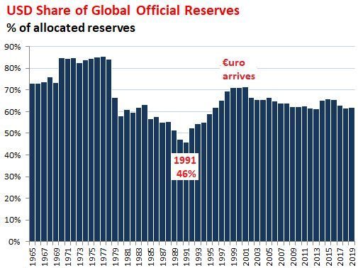 Si echamos un vistazo en el largo plazo, los movimientos recientes de la participación del dólar como divisa de reserva son relativamente pequeños. Hubo movimientos mayores desde 1977 hasta 1991, cuando la participación del dólar en las reservas mundiales de otros países cayó del 85% al 46%, y luego grandes movimientos de subida que establecieron en el año 2000 unas reservas mundiales en dólares del 70%.
