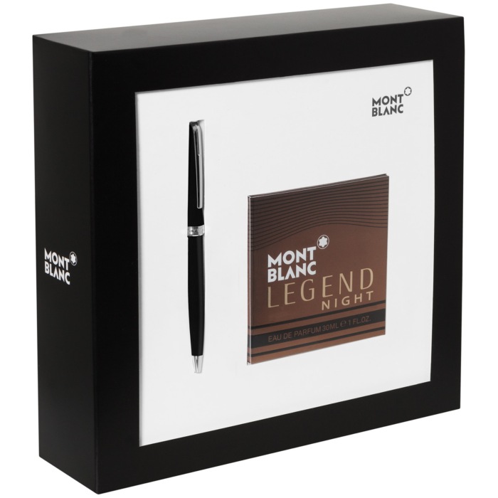 El bolígrafo Montblanc está inspirado en el movimiento arquitectónico Bauhaus. Tiene un diseño purista y es un accesorio de escritura muy ergonómico, como todo lo de la firma Montblanc. Cuenta con un depósito y capuchón de resina y elegantes detalles de color plateado. Junto al bolígrafo se presenta un pequeño frasco del perfume Legend Night.