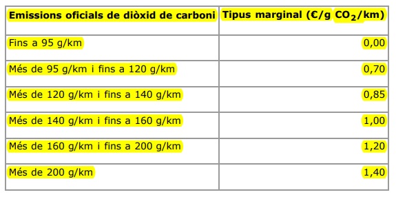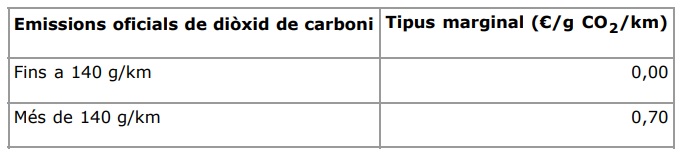 La cuota íntegra se obtiene de aplicar la tarifa que corresponda a las emisiones oficiales de dióxido de carbono por kilómetro del vehículo, de acuerdo con las siguientes tablas:
