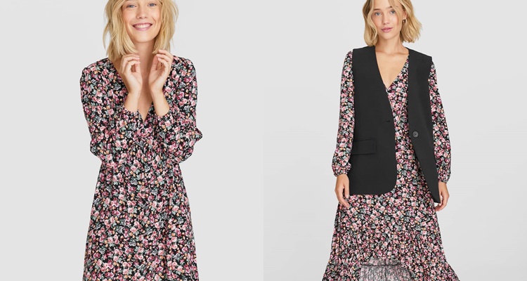 Con su romántico y femenino estampado floral nos encanta para llevar en otoño y en invierno. El toque del chaleco y las sneakers blancas quedan sensacional. Su precio es de 25,99 euros.