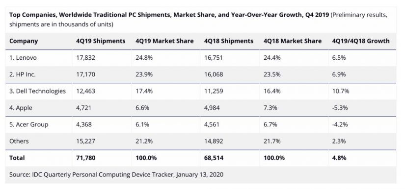 Según los datos de IDC, la firma china Lenovo fue la empresa que más ordenadores vendió en 2019 a nivel mundial, con casi de 64,8 millones de dispositivos, un 8,2% más que en 2018, y una cuota de mercado del 24,3%. A continuación se sitúa HP con una cuota de mercado del 23,6%, tras vender 62,9 millones de unidades, un 4,8% más.