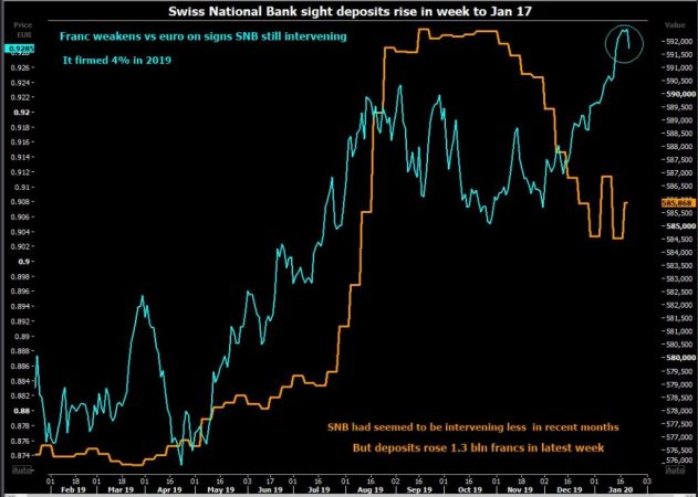 El Banco Nacional Suizo ha tenido un enfoque intervencionista del franco para impulsar la inflación en una economía altamente orientada a la exportación. Aunque los dirigentes del banco central se niegan a hablar sobre su política de gestión de divisas, los inversores utilizan los datos semanales de depósitos a la vista como un un referente para estimar la actividad del Banco Nacional de Suiza en los mercados de divisas.