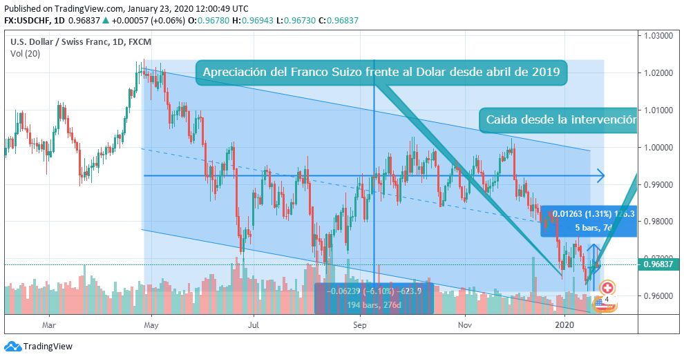El precio del «swissy» ha venido apreciándose frente al billete verde desde abril de 2019 cuando el par toco los 1.0236 dolares por franco. Desde ahí la divisa centro europea no ha hecho más que apreciarse por varios factores, pero principalmente por ser una divisa refugio y las incertidumbres que fueron apareciendo en los mercados financieros a lo largo del año pasado trajeron flujos de capital a Suiza y apreciación de su divisa.
