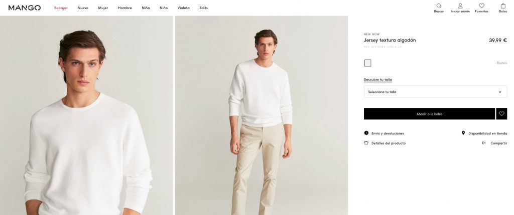 Sigue también un estilo muy casual, como suele ser habitual en Mango. Con tejido de algodón con estructura. Su cuello es redondo y de manga larga. Además, se han usado terminaciones elásticas de canalé.