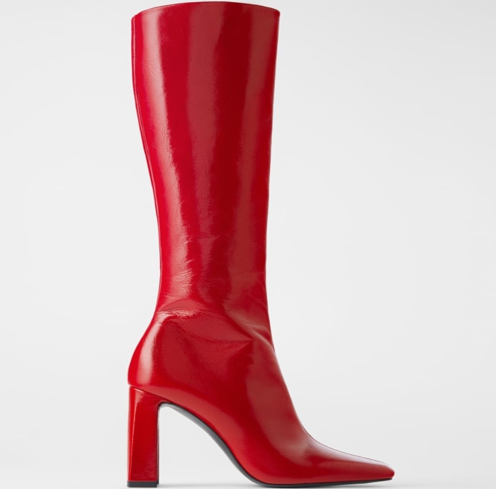 El charol es un tipo de acabado que nunca pasará de moda, y es por ello por lo que en Zara han incluido estas botas rojas de charol en su colección de otoño. Están hechas de piel con un acabado charol efecto craquelado de caña alta.