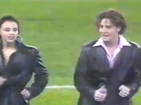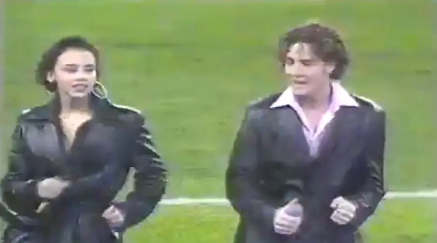 David Bisbal y el resto de sus compañeros cantan sobre el césped del Santiago Bernabéu la canción ‘Vivimos con la selección’, que se creó para apoyar a la Selección Española en el Mundial de Corea y Japón (2002). El pequeño concierto, al que también contribuyeron Café Quijano y el dúo cómico Cruz y Raya, se celebró en la previa de la final de Copa del Rey entre el Real Madrid y el Deportivo, en el famoso ‘centenariazo’.