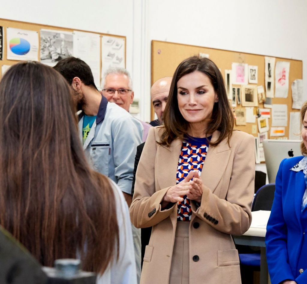 De las pocas veces que se le ha visto repetir de forma tan seguida modelo a la Reina Letizia fue en la visita a la Escuela de Grabado y Diseño Gráfico de la Real Casa de la Moneda. Días anteriores ella y el Rey Felipe habían tenido la famosa pelea de la misa en Mallorca y el ambiente aún estaba caldeado.