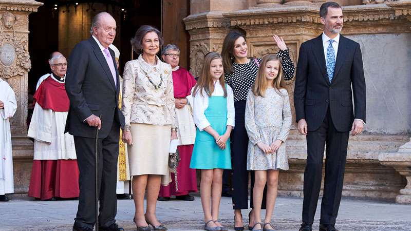 En un lado los Reyes Eméritos con cara de circunstancia, en medio la Reina Letizia agarrando a sus hijas y un poco más separado el Rey Felipe VI intentando aguantar el tipo.