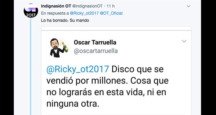 Su marido Óscar Tarruella se enfadó y dijo “disco que se vendió por millones. Cosa que no lograrás en esta vida, ni en ninguna otra”. Eso sí, después pidió disculpas y borró el tuit, pero cientos de internautas lograron capturar la pantalla.