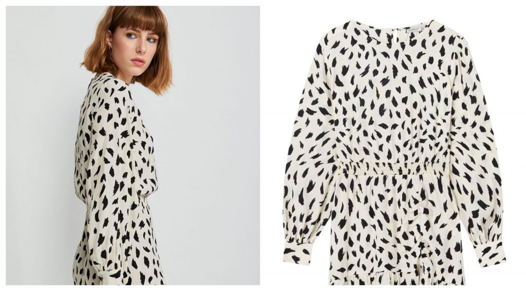 Se trata de un vestido mini con manga abullonada y que termina con un suave volante en la parte de la pierna.