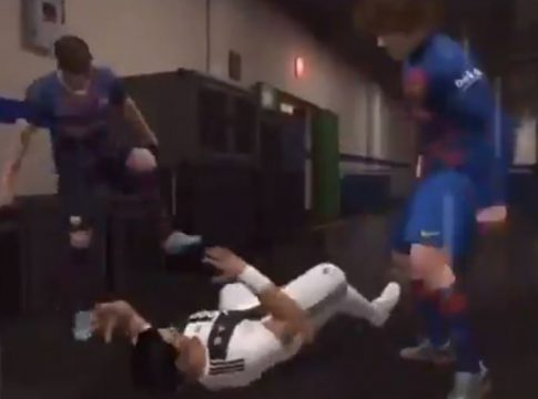 Puñetazos por detrás, patadas una vez se encuentra Cristiano Ronaldo en el suelo… Y Neymar al rescate. El futbolista del PSG aparece para calmar a sus ex compañeros y frenar esas agresiones que supuestamente se producen en los aledaños de un estadio.