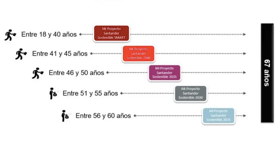 Mi Proyecto Santander Sostenible es una gama de ciclo vida, gestionada por el equipo Global Multi Asset Solutions (GMAS) de España, que está formado por cinco fondos mixtos globales. Mi Proyecto Santander Sostenible Smart, Mi Proyecto Santander Sostenible 2040, Mi Proyecto Santander Sostenible 2035, Mi Proyecto Santander Sostenible 2030 y Mi Proyecto Santander Sostenible 2025. Estos cinco productos se adaptan al perfil de inversión y a la edad prevista de jubilación de cada partícipe. La estrategia de ciclo de vida ofrece una cartera diversificada que reduce el nivel de riesgo del plan de pensiones a medida que se acerca la fecha objetivo de jubilación. Y, a diferencia de otros productos, no es necesario cambiar el plan con el paso del tiempo sino que se ajusta anualmente la asignación de activos a cada ahorrador, reduciendo la exposición a renta variable y aumentando el peso de la renta fija.