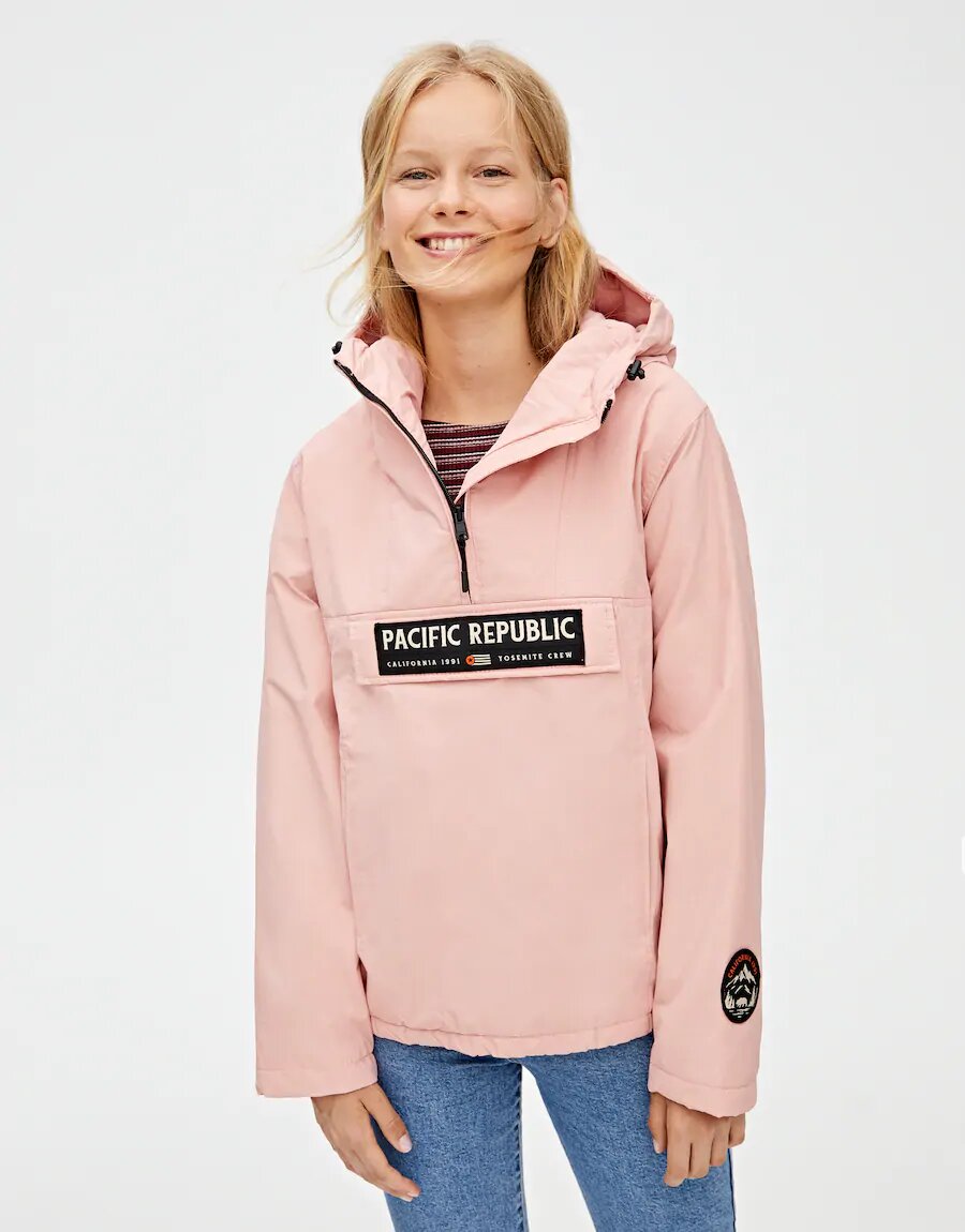 Aunque, si te apetece lucir un outfit más sport, nada mejor que esta cazadora de Pull & Bear estilo canguro con nylon y capucha. Un modelo con cierre de cremallera hasta el pecho y u parche de Pacifi Republic en el pecho para darle un toque más moderno.