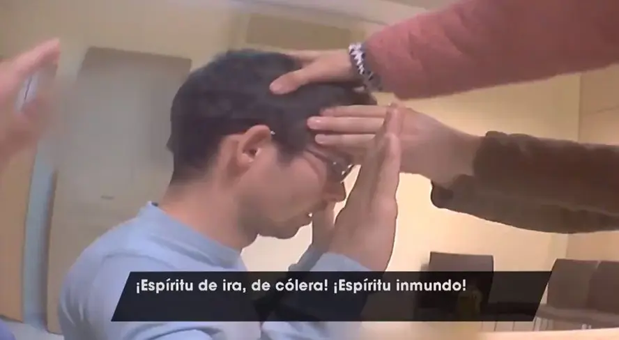 Las imágenes son de lo más estremecedoras. “Apártate satanás. Espíritu inmundo, fuera de aquí en el nombre de Jesús”, exclama la persona encarga de realizar este ‘exorcismo’, que a la vista de las imágenes no se trata de ningún cura. “Espíritu de homosexualismo. Espíritu de sexo, de fornicación de adulterio”, exclama el protagonista, ante la no sorpresa del colaborador de televisión, que conocía la prueba a la que iba a someterse.