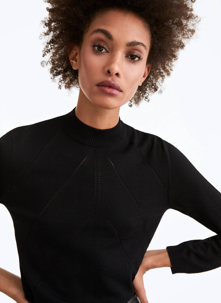 Se trata de su cuello Perkins, el cual recibe el nombre por el vestuario que usaba el actor Anthony Perkins, quien personificó a Norman Bates en el thriller Psicosis de 1960. Aquellos jerséis de punto que usaba el actor con el cuello tan particular, que no era un cuello alto, pero tampoco era escote chimenea. El diseño de calados y acabados en rib también le otorgan su toque especial. Otro detalle a destacar es que lo puedes adquirir en color negro o marfil.