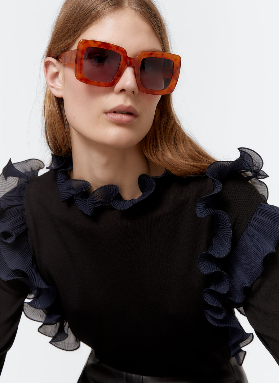 Otro de los jerséis en negro de Uterqüe que es toda una joya. Y es que lo simple no se lleva, en la firma lo saben y por eso han creado este magnífico diseño con volantes de lo más adorables. Pero no te confundas, no entra en ese estilo romántico, tierno pero no lo suficiente.